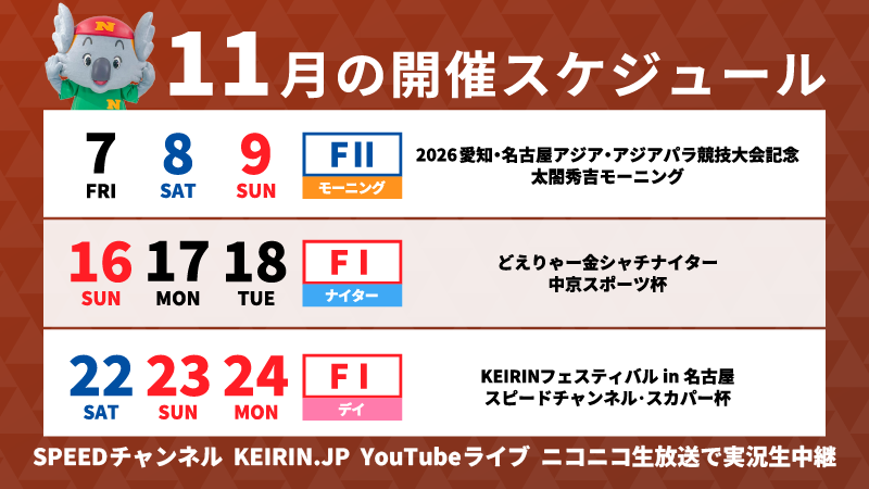 | 10月31日(金)〜10月31日(金) | 四日市競輪場 | ![]() | 【四日市】泗水杯争奪戦 |