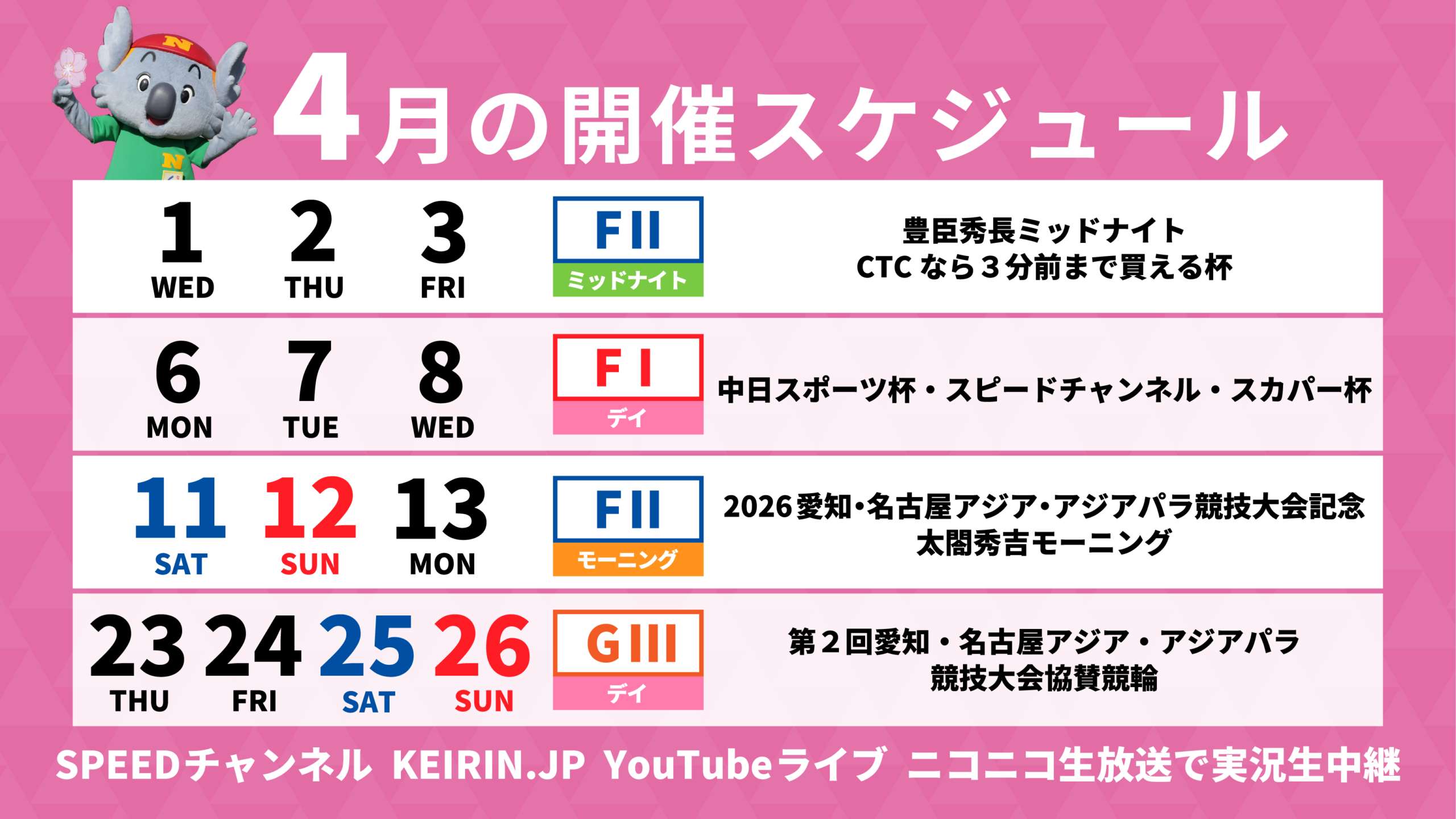 | 3月25日(水)〜3月27日(金) | 名古屋 | ![]() | 【名古屋】競輪アプリはウィンチケット杯 |