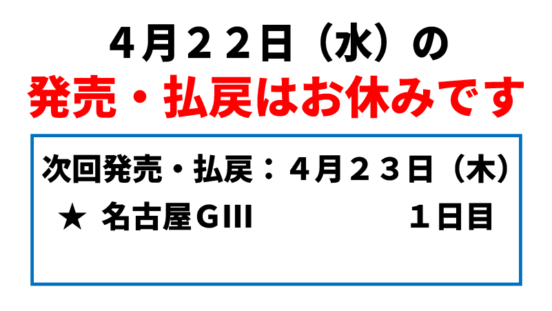 | 4/1(水)〜4/3(金) | 本場![]() 【名古屋】秀長МD CTCなら3分前まで |
