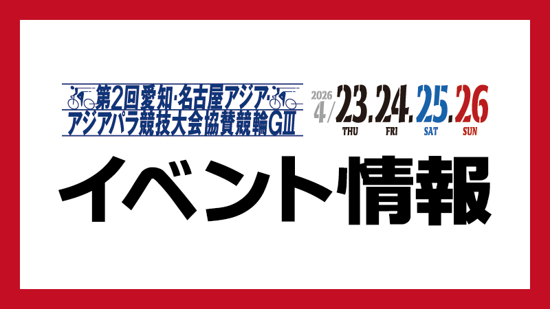 | 4/23(木)〜4/26(日) | 本場![]() 【名古屋】アジア・アジアパラ大会協賛競輪 |