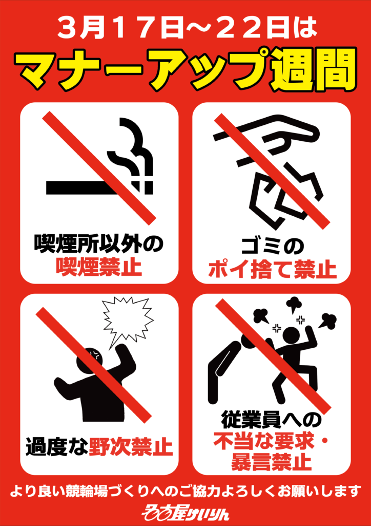 名古屋競輪場では、2026年3月17日(火)~22日(日)を「マナーアップ週間」といたします。
