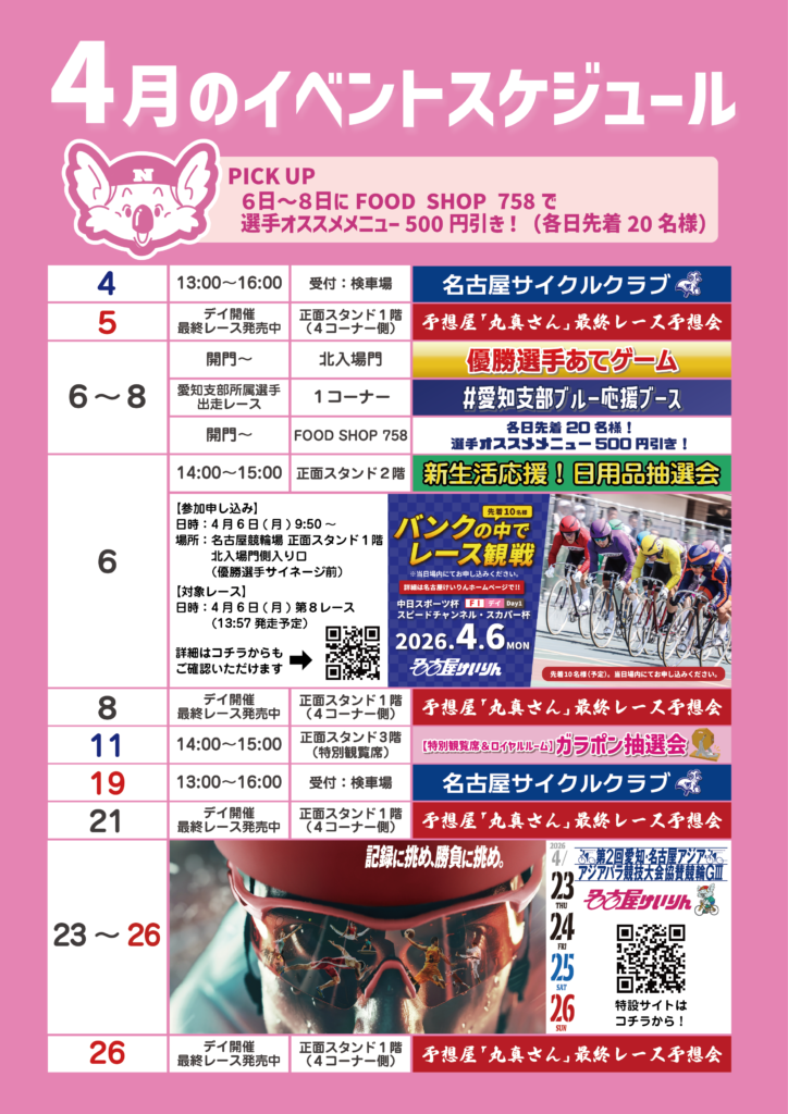 【イベント】2026年4月のスケジュール 2026.03.30 最終更新日時 : 2026.03.30 編集者名古屋競輪 2026年4月のイベントスケジュールは以下の通りです。 皆様のご来場をお待ちしております!