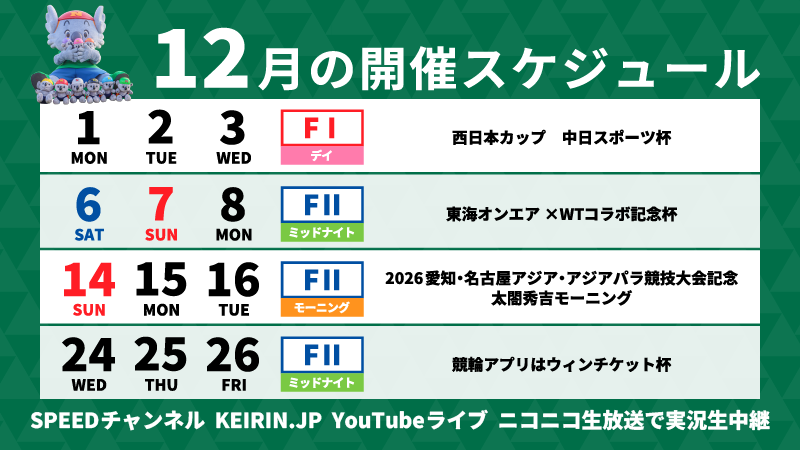 | 11月22日(土)〜11月24日(月) | 名古屋 | ![]() | 【名古屋】KEIRINフェスティバル スピードチャンネル・スカパー杯 |